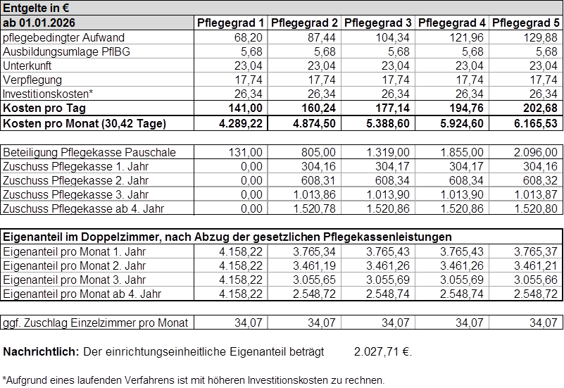 Alle oben genannten Pflegesätze werden regelmäßig neu mit dem Landschaftsverband Westfalen-Lippe und der Arbeitsgemeinschaft der Pflegekassen in NRW vereinbart. Daher können wir für die Aktualität der jeweils genannten Beträge keine Gewähr geben. Druckfehler und Irrtümer sind vorbehalten.